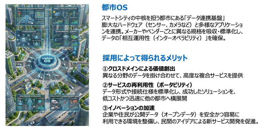 現代都市の複雑な社会課題を解決するうえで、行政や社会インフラでのDX、そしてスマートシティの構築・運用は不可欠になります。都市OSの有効活用が、課題解決に向けたシステムの構築と、付加価値の高いサービスの創出を後押ししそうです。さらに、デジタルツインや世界モデルのような最新技術を逐次導入することで、都市での生活やビジネス、社会活動は、より豊かで、安全・安心、効率的なものへと発展していくことでしょう。