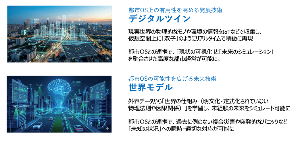 さらに、FIWAREなどの都市OSの有用性を高める発展技術があります。「デジタルツイン」と、「世界モデル」です。