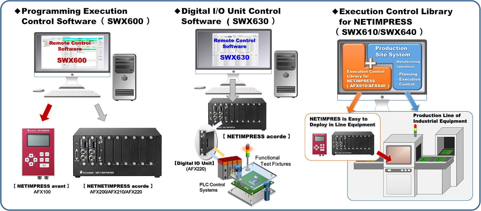 - SWX610/SWX640:DLLs Library for Linking NETIMPRESS avant/acorde Execution Control to User Applications on the Production Line